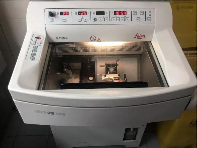 术中冰冻的第二个特点就是“冻”。病理科收到标本后要进行专业取材,通俗的来说就是把最有代表性的那块肉切一小块给它冻上。放在冰冻机里进行冷冻,目的是将组织冻硬,方便切片。想象一下做饭切肉的过程,一般从冰箱里拿出来冻硬的肉直接切的话会切成一片一片的,原理很相似,只不过这个更专业一些。最后进行染色,冰冻切片就做好了。具有一定资质的病理医生在显微镜下进行诊断,最后发出冰冻报告。