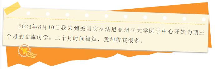 除此以外,本次短期访学也拓展了我的视野,开发了潜力,在一个全新的环境中如何调整适应,以应对将来纷繁复杂的挑战。感谢河北省人社厅提供这么好的项目,感谢院领导允许我到美国访学,我要用热情和专业回馈医院和社会,尽最大的努力发挥自己的能力。
