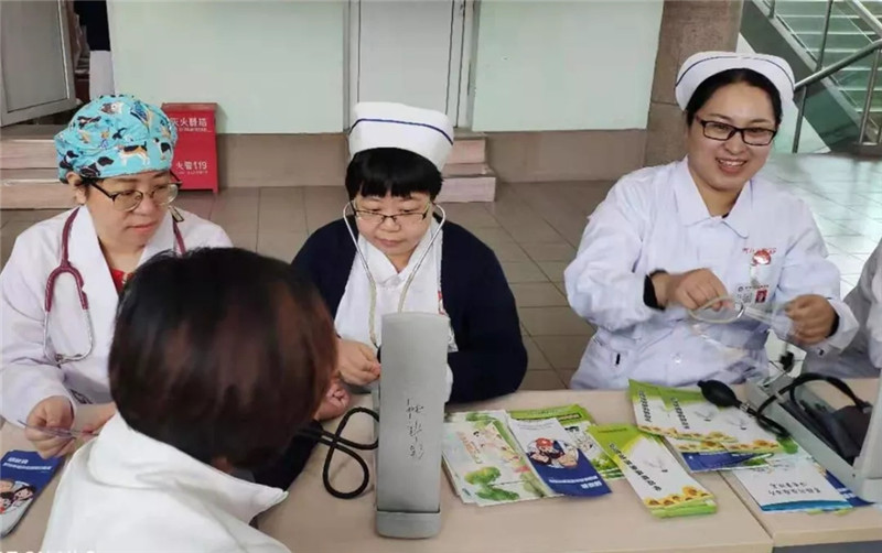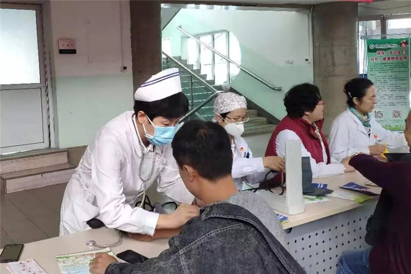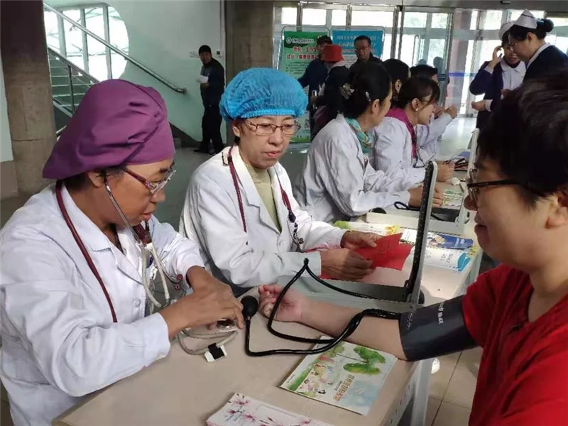 第八党总支部党员做好病区查房工作后早早来到义诊现场,准备义诊事宜,在肿瘤科主任臧爱民、结核科主任田彦卿、全科医学科主任郝福庆、放射治疗科主任史鸿云的带领下义诊活动如火如荼地展开。义诊现场,医务人员通过发放宣传资料、悬挂横幅、免费测量血压及健康咨询等形式进行宣传。
