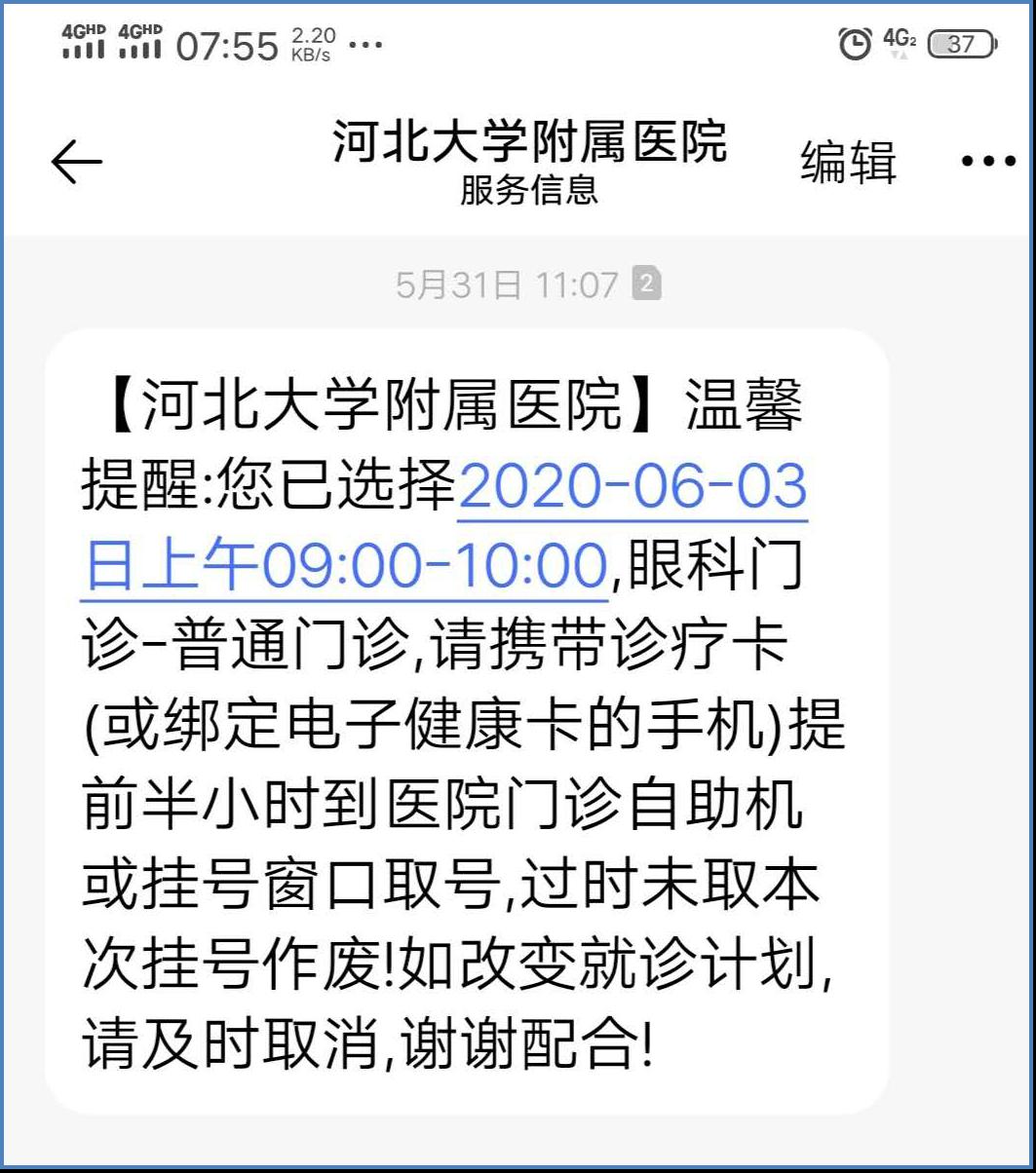 3.请提前出示预约凭证进入门诊区域。短信通知如图: