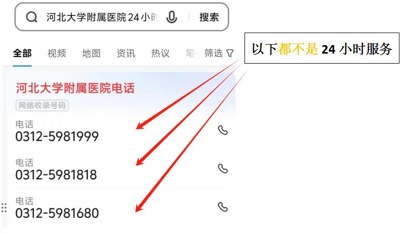 网络搜索河北大学附属医院24小时咨询电话,出现下图信息,均不严谨: