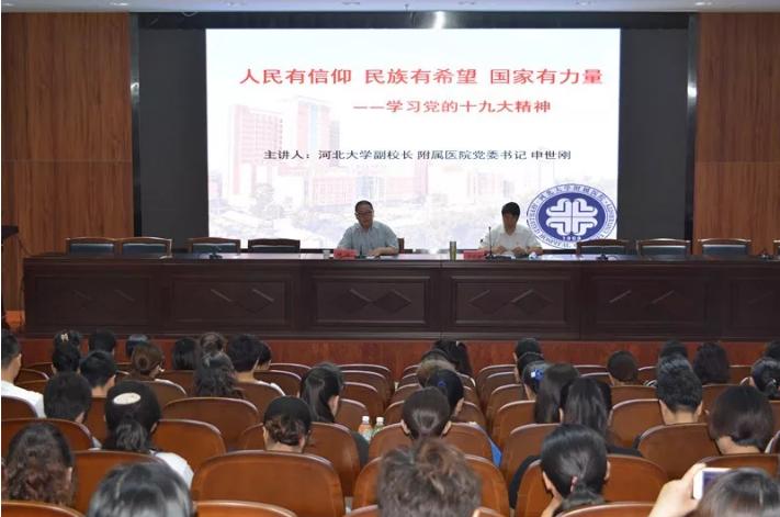 为庆祝中国共产党成立97周年,进一步学习宣传贯彻党的十九大精神和习近平新时代中国特色社会主义思想,深入推进党中央关于加强公立医院党建工作的部署,教育引导广大党员干部继承和发扬党的光荣传统和优良作风,7月11日下午河北大学副校长、我院党委书记申世刚为我院护理工作者宣讲十九大精神,党委副书记陈冰出席并主持报告会。