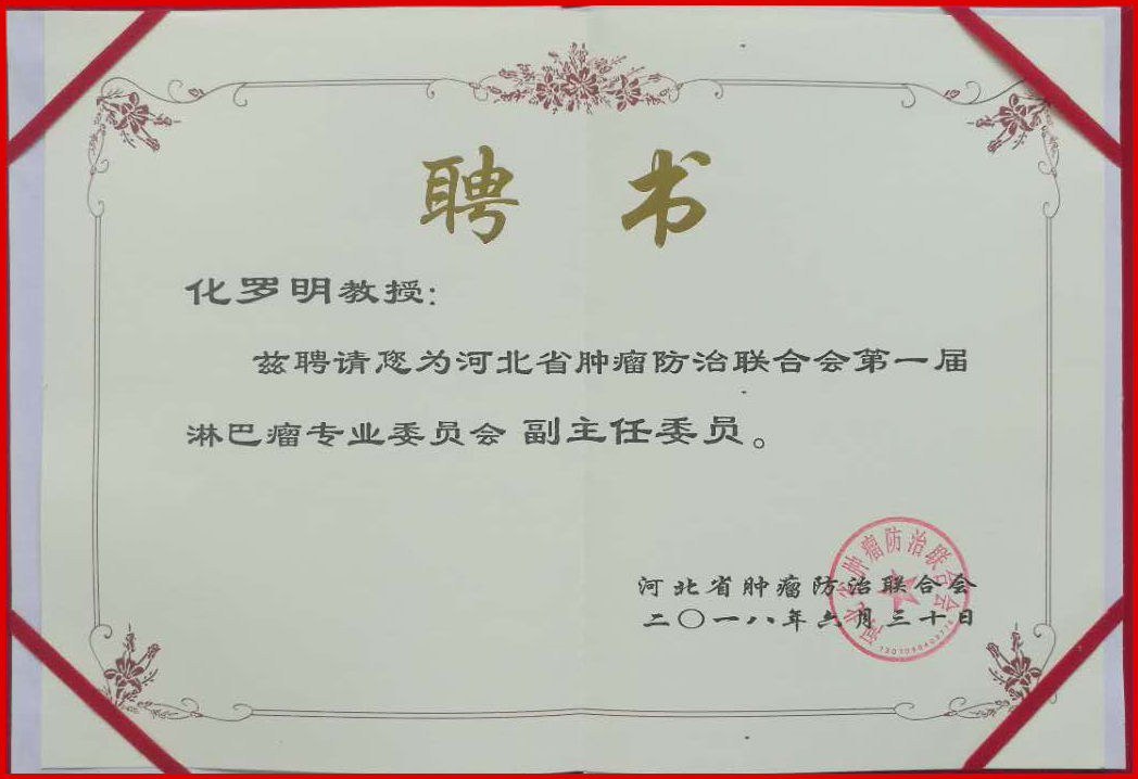 , 化罗明教授被聘为河北省肿瘤防治联合会第一届淋巴瘤专业委员会副主任委员。