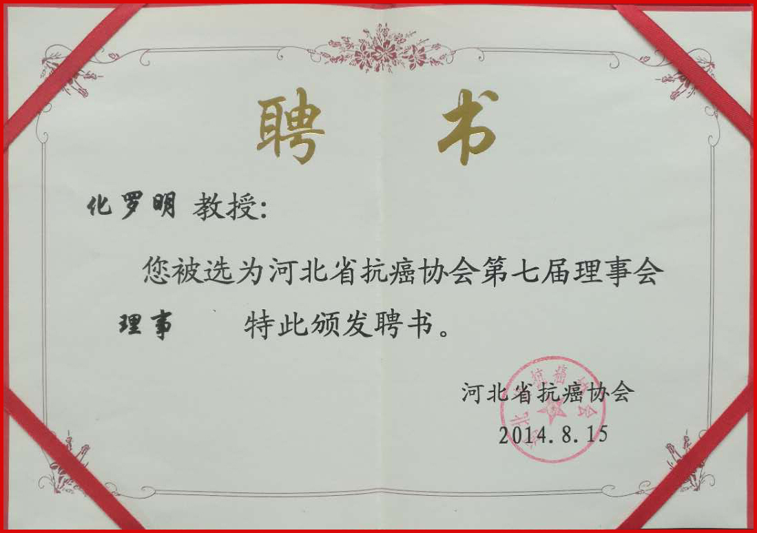 , 化罗明教授被聘请为河北省抗癌协会第七届理事会理事。