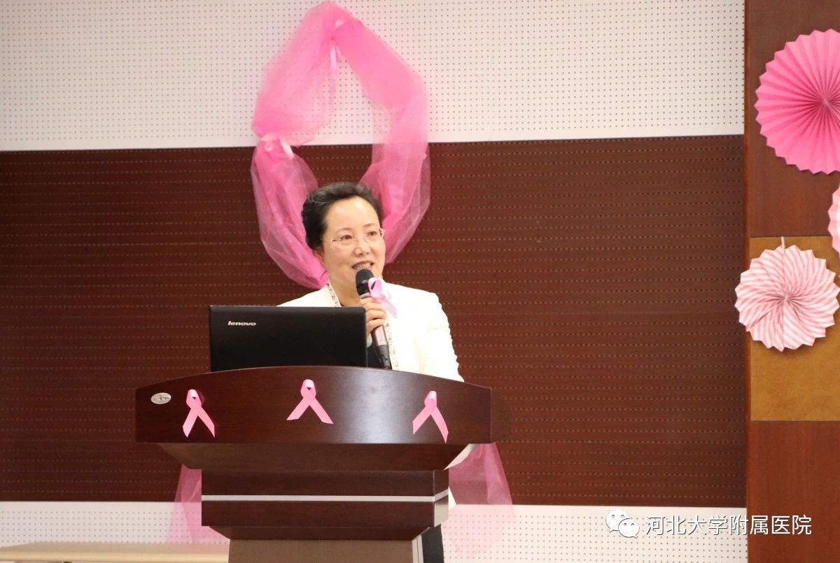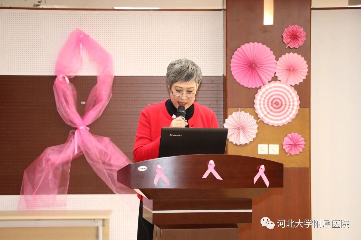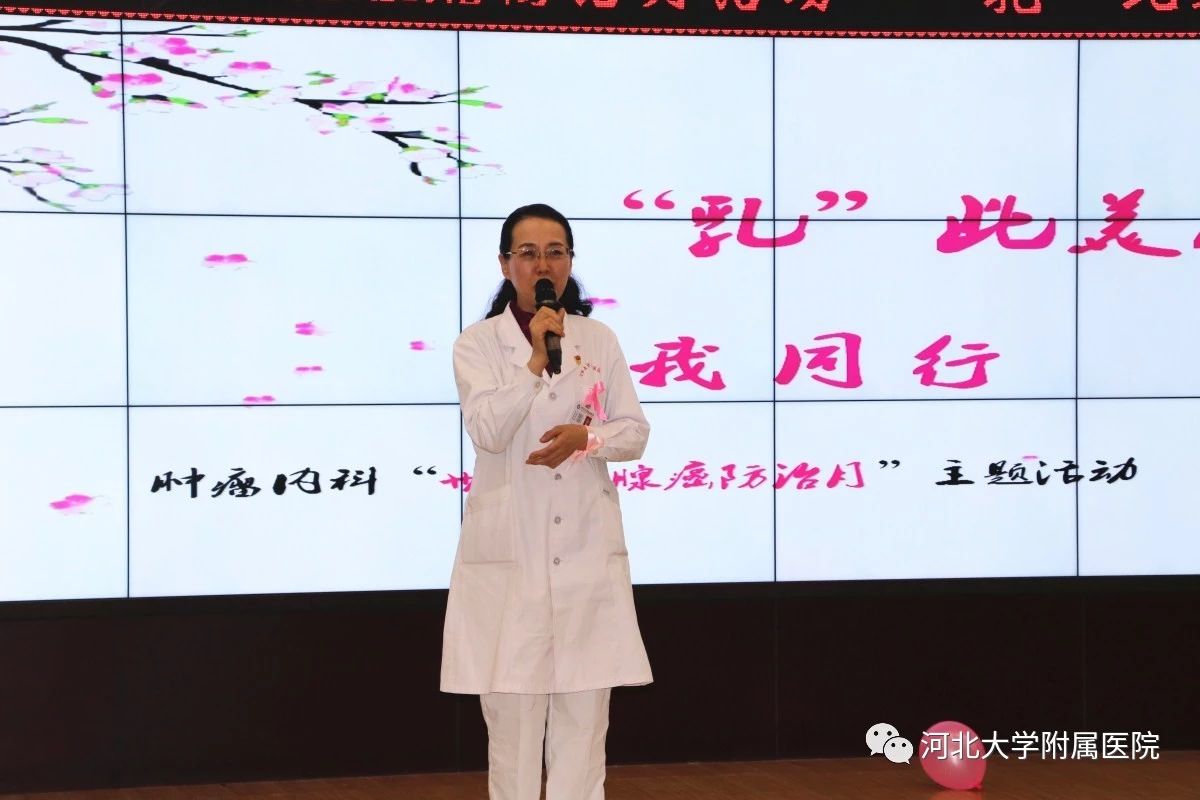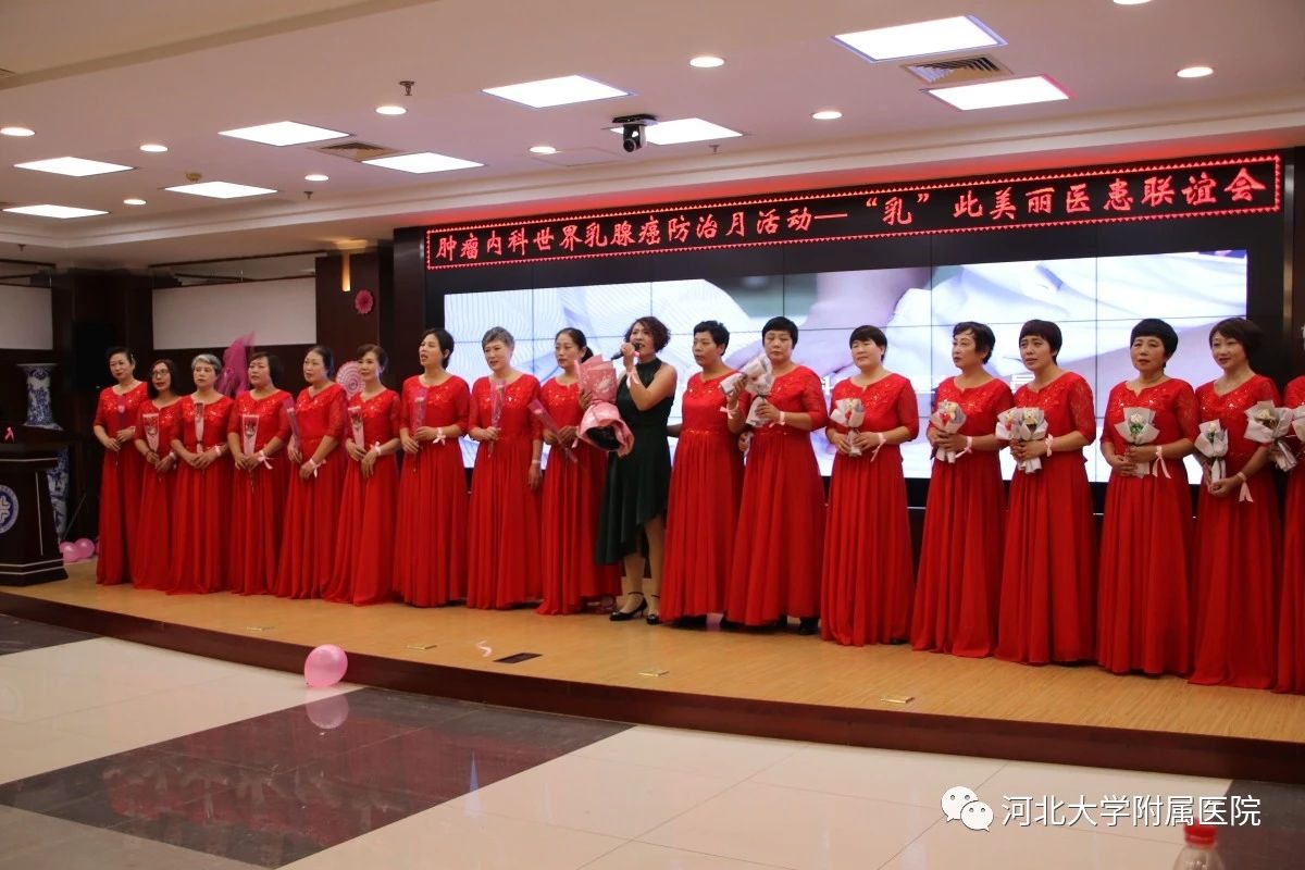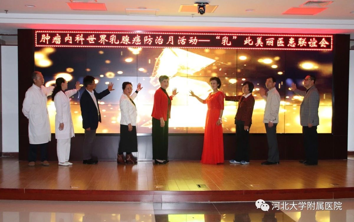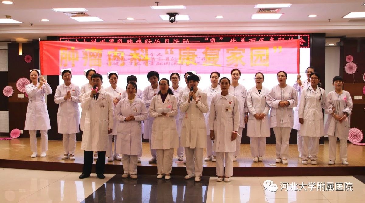 我院肿瘤内科成立于1997年,从初建时的18张床位到今天的260张床位,从纯粹的临床型科室到专业的细化、GCP的通过、试验室的建立逐步向科研型科室转变,至今已成为国内知名、省内领先的科室。而随着医疗水平的不断提升,恶性肿瘤患者的生存期亦不断提升,例如乳腺癌的治疗效果已超越了糖尿病。20年的风雨兼程,生死与共,肿瘤内科的医务工作者和一大批的患友相识相知,成为生命中的伙伴,与他们相伴前行的患者越来越多。越来越多的患者需要一个和伙伴分享泪与笑的场所,需要一个互相依偎,相互鼓励的平台,更有坚强大爱的患友希望把自己的勇气和力量分享给其他的朋友。由此,为了满足患者的需求,为了更好地服务患者回馈社会,河北大学附属医院肿瘤内科“康复家园”在2018年10月10日正式成立并举办了“乳”此美丽大型医患联谊会。同时恰逢10月——“世界乳腺癌防治月”,粉红丝带月活动我院肿瘤内科乳腺组也正式启动。