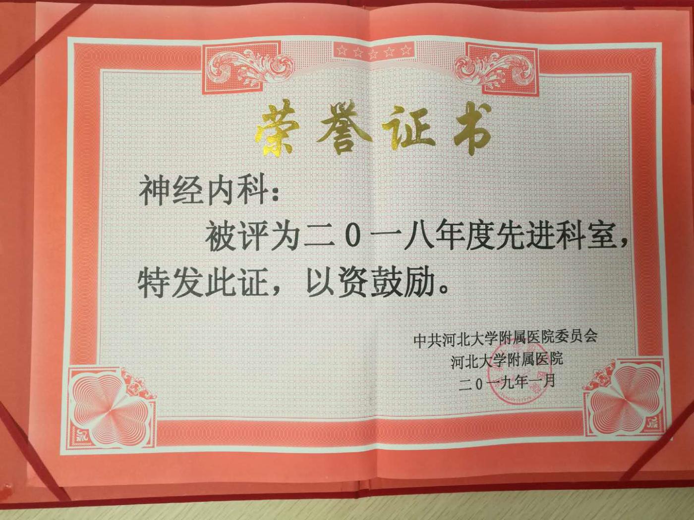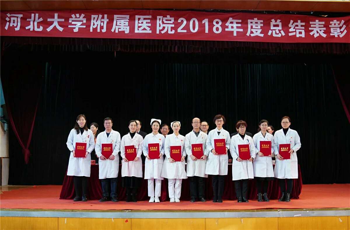 我科荣获河北大学附属医院2018年度先进科室称号,图为我科李晓芳主任上台领奖。