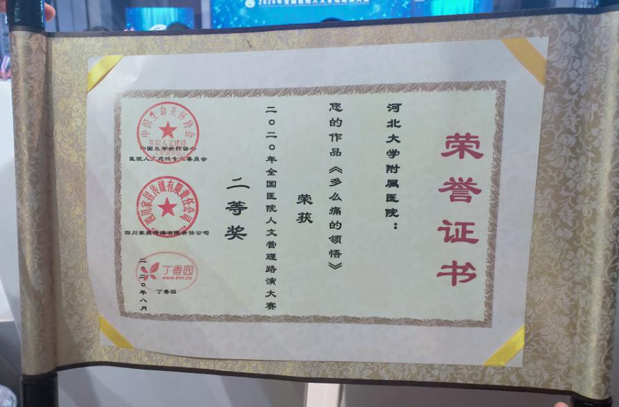 2020年8月28~29日,由中国生命关怀协会医院人文建设专业委员会与《家庭与生活报》、丁香园、澎湃新闻等机构联合举办的首届全国医院人文管理路演大赛决赛及颁奖典礼在成都举行,我院党委选送的第八党总支肿瘤内科人文关怀作品《多么痛的领悟》从全国各地400多家医疗机构的作品中脱颖而出,经过评委会初选、复审、复评、合议、后进入全国36强参加决赛,通过两天的激烈角逐,我院作品最终斩获大赛二等奖。