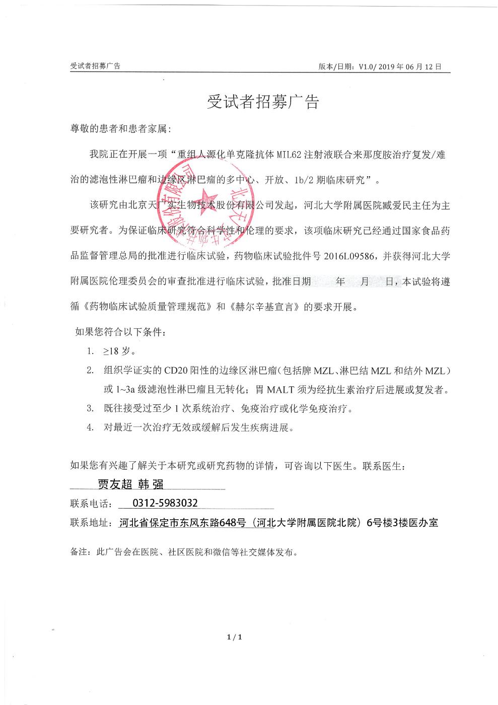 【临床试验招募】MIL62注射液联合来那度胺胶囊治疗复发/难治滤泡性淋巴瘤和边缘区淋巴瘤1b/2期临床试验