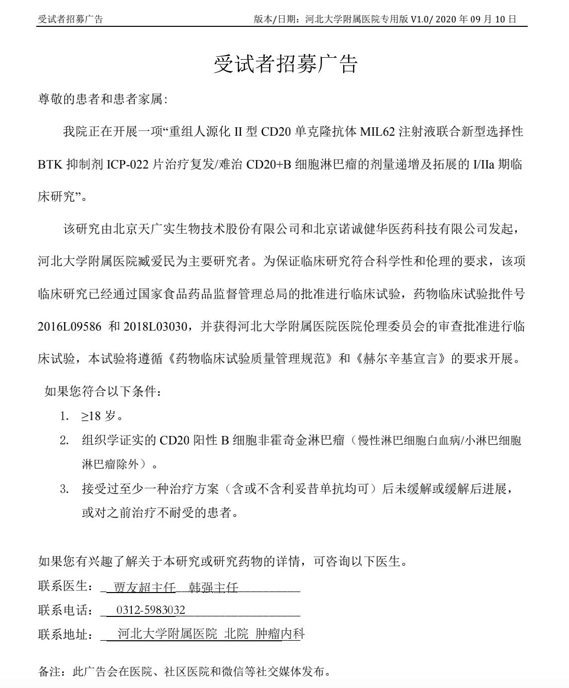【临床试验招募】重组人源化 II 型 CD20 单克隆抗体 MIL62 注射液联合新型选择性 BTK 抑制剂ICP-022 片治疗复发/难治 CD20+B 细胞淋巴瘤的剂量递增及拓展的 I/IIa 期临床研究
