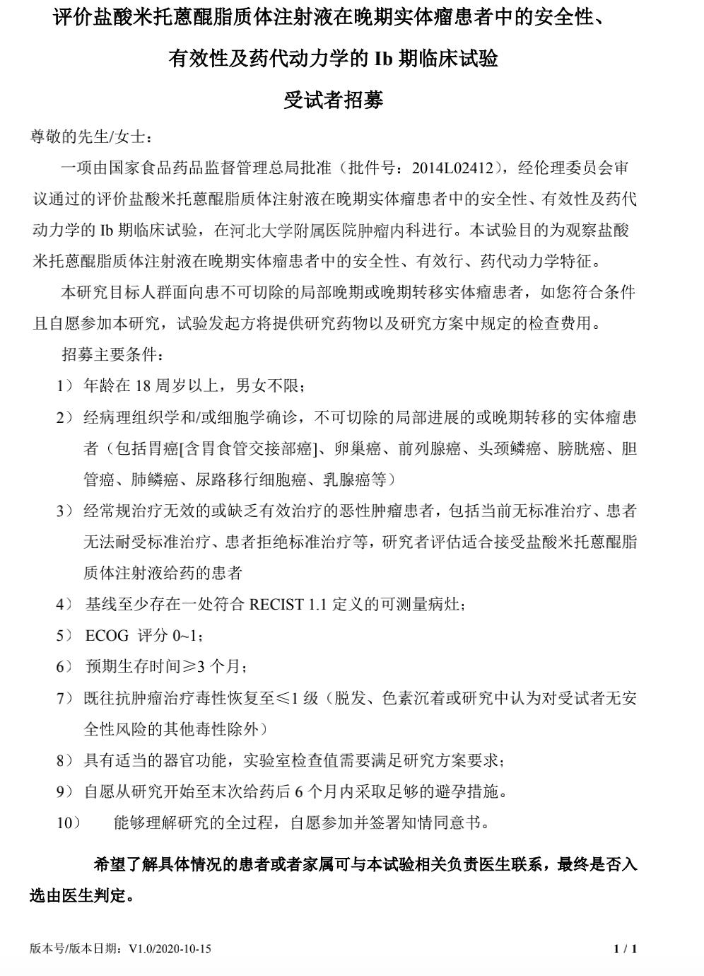 【临床试验招募】评价盐酸米托蒽醌脂质体注射液在晚期实体瘤患者中的安全性、有效性及药代动力学的Ib期临床试验
