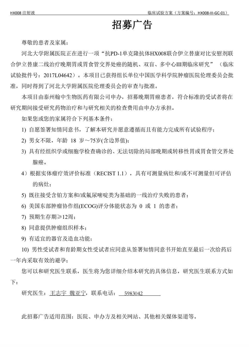 【临床试验招募】抗PD-1 单克隆抗体HX008 联合伊立替康对比安慰剂联合伊立替康二线治疗晚期胃或胃食管交界处癌的随机、双盲、多中心III 期临床研究