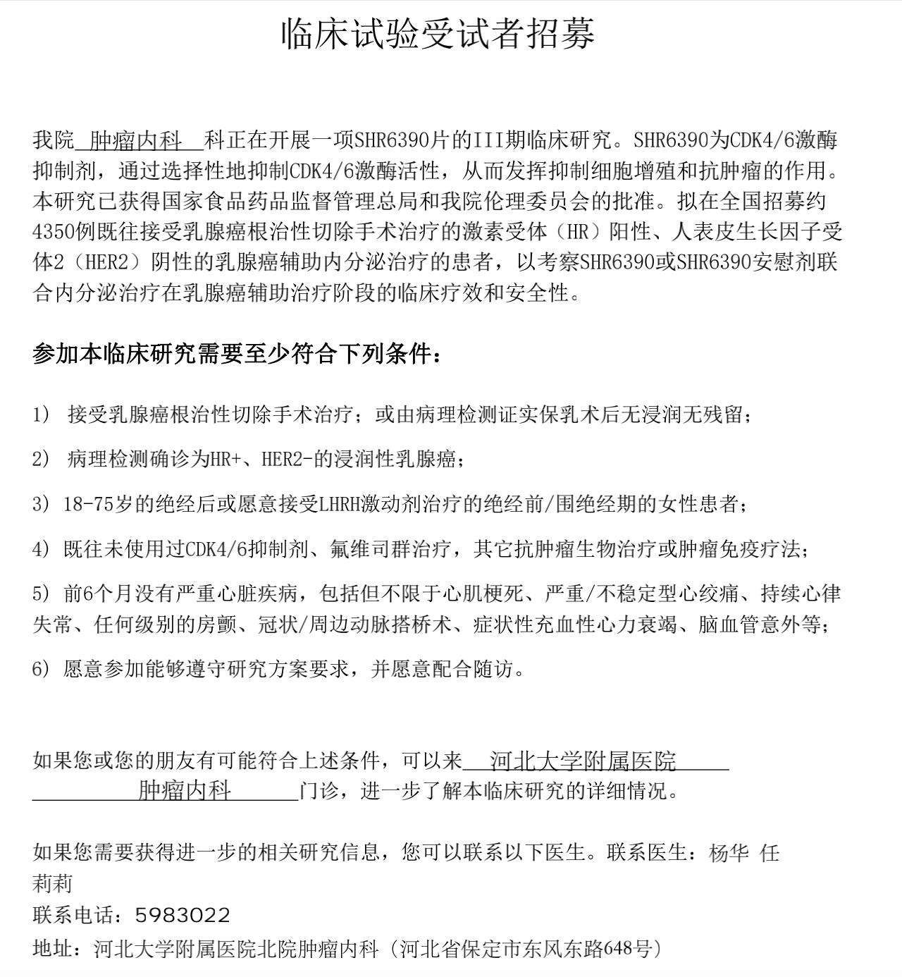 【临床试验招募】SHR6390(口服CDK4/6 抑制剂)联合内分泌治疗在激素受体阳性、HER2 阴性女性乳腺癌辅助治疗中的多中心、随机、双盲的III 期临床试验