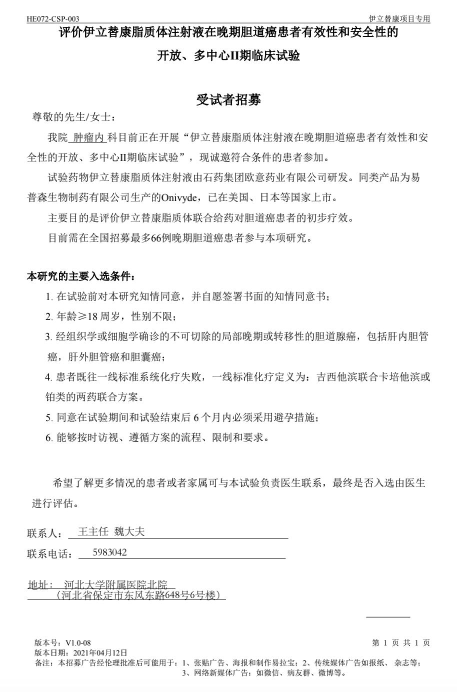 【临床试验招募】伊立替康脂质体注射液在晚期胆道癌患者有效性和安 全性的开放、多中心Ⅱ期临床试验