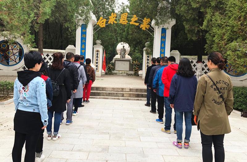 大家经过一个多小时的车程,首先来到晋察冀烈士陵园。这里是中国共产党所建的较早烈士陵园之一,位于唐县军城镇南关村。园内苍松翠柏,林墓相间,庄严肃穆。林荫下长眠着伟大的国际主义战士白求恩、柯棣华、傅莱、琼?尤恩等。在白求恩墓前,党员同志们默哀三分钟,感受国际主义战士毫无利己、精益求精、无私奉献的革命主义精神。