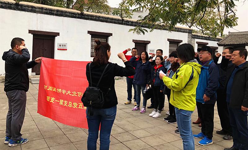 随后,大家又来到了晋察冀军区司令部旧址。听讲解员讲述艰难且光辉的解放战争史,看旧址展馆的图片、实物及复制品,思今天幸福生活来之不易。在司令部小院内,大家面对党旗重温入党誓词。“我志愿加入中国共产党,拥护党的纲领,遵守党的章程,履行党员义务,执行党的决定,严守党的纪律,保守党的秘密,对党忠诚,积极工作,为共产主义奋斗终身,随时准备为党和人民牺牲一切,永不叛党。”当紧握拳头的右手举起时,大家感受到了身上肩负的神圣使命和责任,“对党忠诚、永不叛党”这是所有党员们对党和人民做出的庄严承诺,时刻谨记自己的誓言、牢记自己是一名共产党员、增强争做合格党员的光荣感、责任感、使命感。