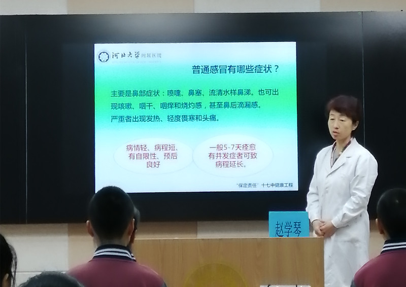 12月3日早晨,“保定责任”健康专家、我院大内科主任、主任医师、保定市医学会呼吸学会副主任委员赵学琴走进保定市第十七中学校园录播教室,以《防感冒 讲礼仪》为题,向近3000名师生进行传染性疾病普通感冒及流行性感冒预防常识科普。自此,“保定责任”校园健康晨会在保定市第十七中学正式启动。