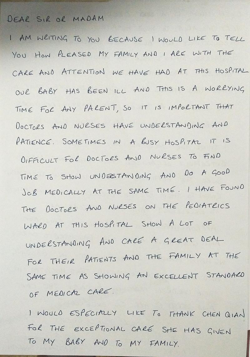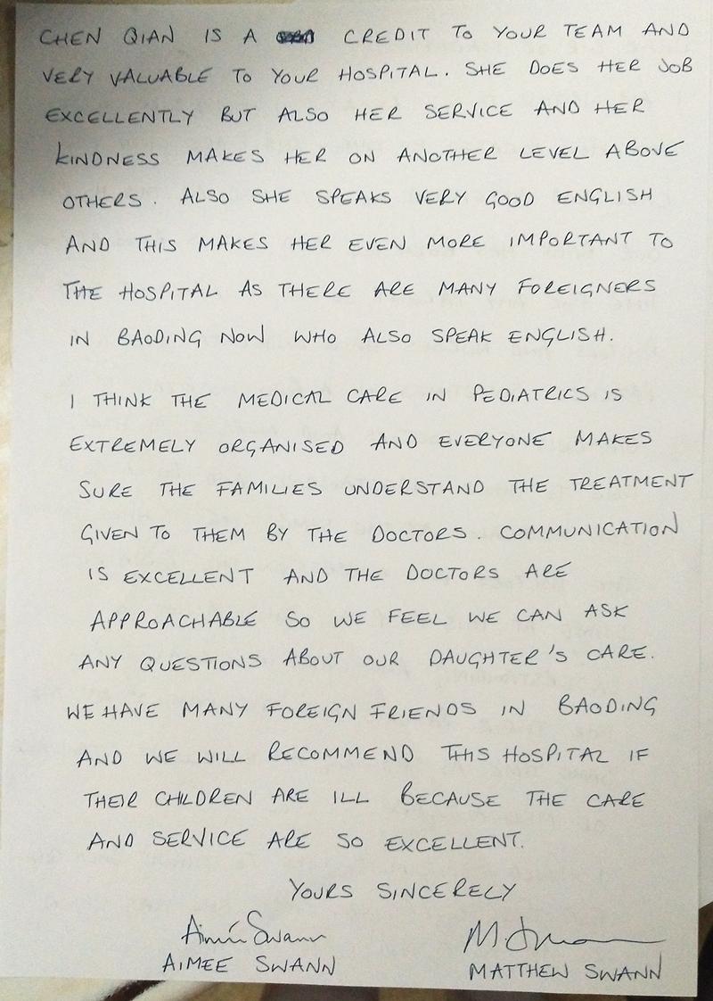 Aimee为了表示感谢,出院前特意写了一封表扬信。信中表达了对我院的感谢,同时夸赞医护人员的优秀医疗水平,工作井然有序,对患儿表现出极大的理解、关心和照顾。信中对陈谦特别提出表扬,既善良又出色的她,给予了菲菲母女无微不至地关心照顾,还要把我院推荐给其他在保定的外国人,因为这个医院值得信任!