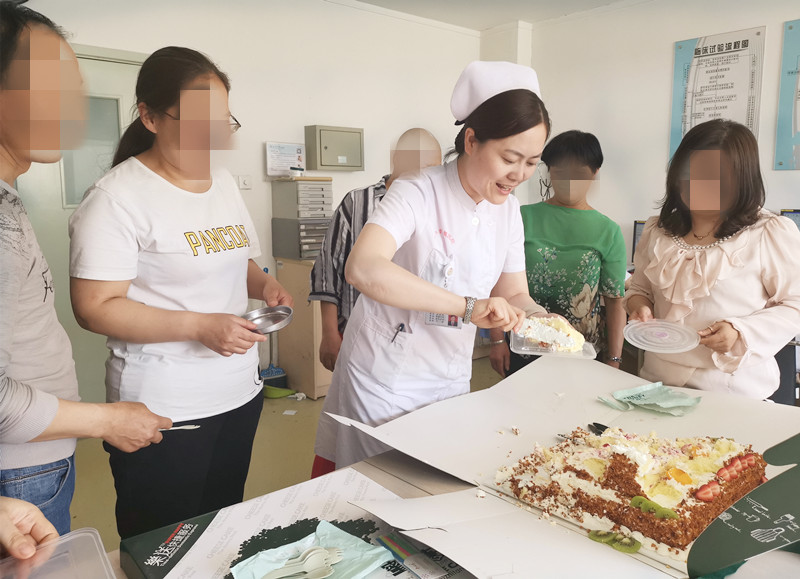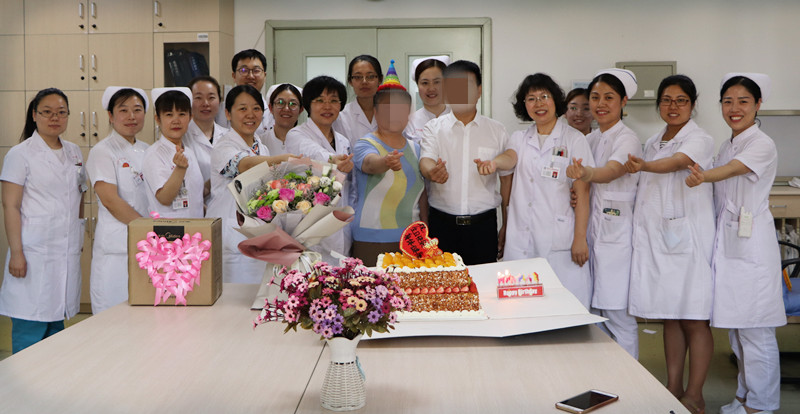5月20日上午,我院肿瘤内科一病区传来了阵阵生日快乐歌和开心的笑声,许多患者和患者家属好奇地向医办室内张望,只见桌上摆着漂亮的鲜花和生日蛋糕。这是一场特别的生日宴会,寿星是一位十年前不幸罹患癌症的63岁邢阿姨,而此次生日party是阿姨患病以来第二次在肿瘤内科的病房里举行了。