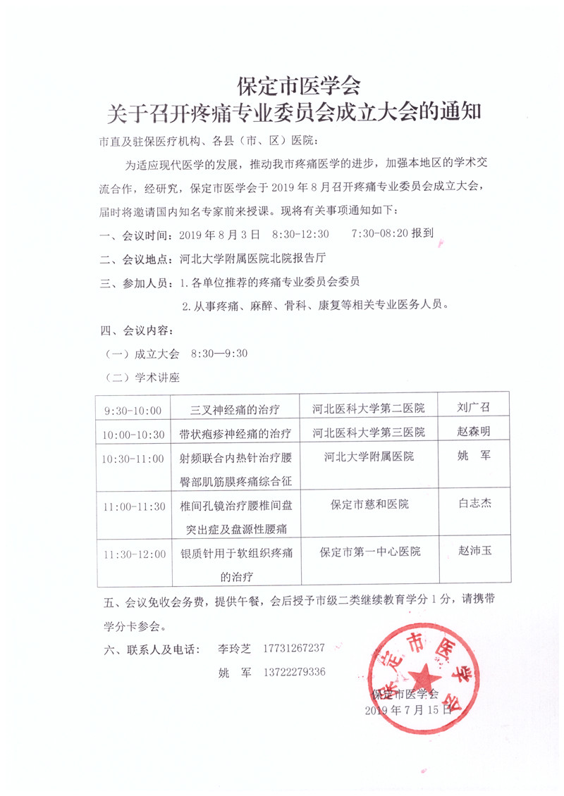 为适应现代医学的发展,推动保定市疼痛医学的进步,加强本地区的学术交流合作,经保定市医学会研究批准,将于2019年8月3日在我院召开疼痛专业委员会成立大会。并邀请了省内知名专家授课,在此,我们诚挚邀请各位疼痛、麻醉、肿瘤、神经、骨科、康复等相关专业医务人员积极参加。