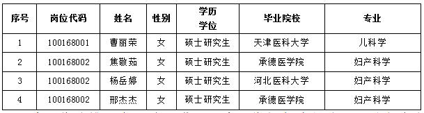 根据《河北省事业单位公开招聘工作人员暂行办法》和《河北大学附属医院2019年公开招聘工作人员公告》,经报名资格审查、考试、考察、体检等程序,确定以下曹丽荣等4人为拟聘人员,现予以公示: