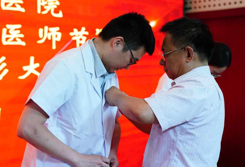 张海松为新入职医师代表授予白衣、佩戴院徽。新入职医师代表王元在发言中表示,将努力继承我院老一辈医师的优良传统,发扬大医精诚的精神,不断学习,牢记一名医务工作者的神圣使命,为医院发展贡献自己的一份力量。