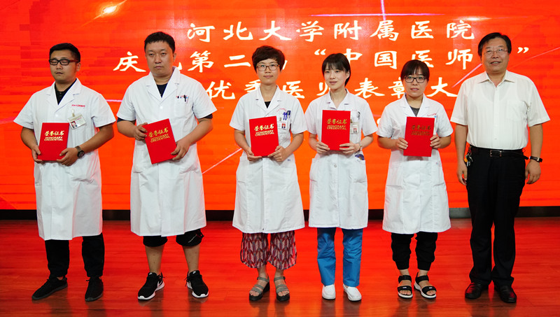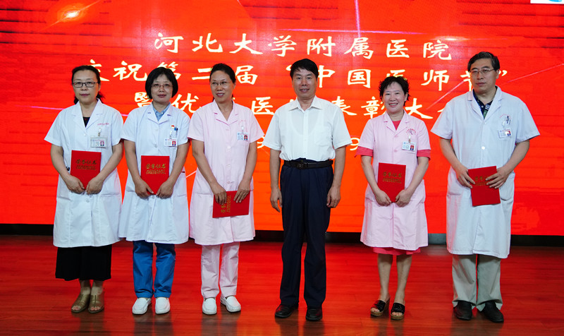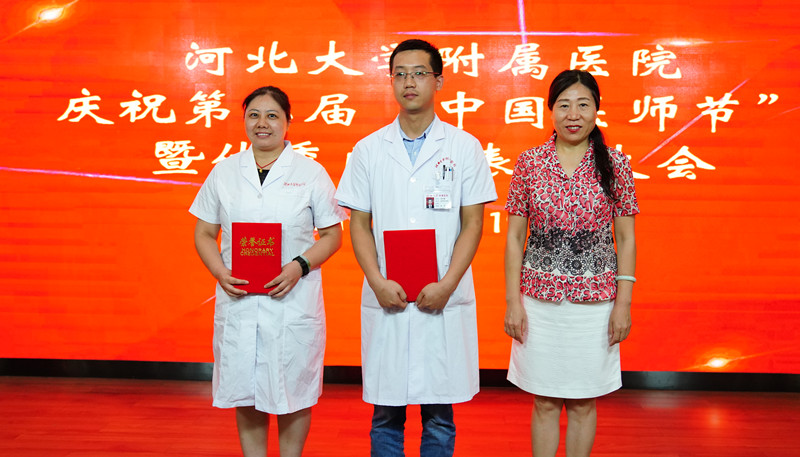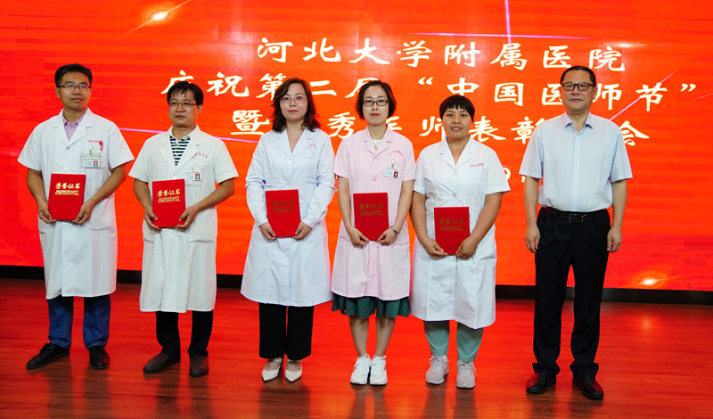 会上,分别表彰了河北大学附属医院第二届“中国医师节”健康卫士——“铭功奖”获得者,他们是:鲁素彩、陈彦霞、周洪月、谢雪兰、石军荣;河北大学附属医院第二届“中国医师节”健康卫士——“铭心奖”获得者,他们是:张惠、姜晔、安娜、古德强、陈磊;河北大学附属医院第二届“中国医师节”健康卫士——“铭志奖”获得者,他们是:陈渊、周元龙、鲁静、吕晓兰、赵水苗;河北大学附属医院第二届“中国医师节”健康卫士——“岗位技能标兵”,他们是:辛磊、王栋;河北大学附属医院第二届“中国医师节”健康卫士——“优秀病历奖”名单,他们是:董少永、于洋、陈渊、王鲁奇。院领导分别为获奖者颁奖。