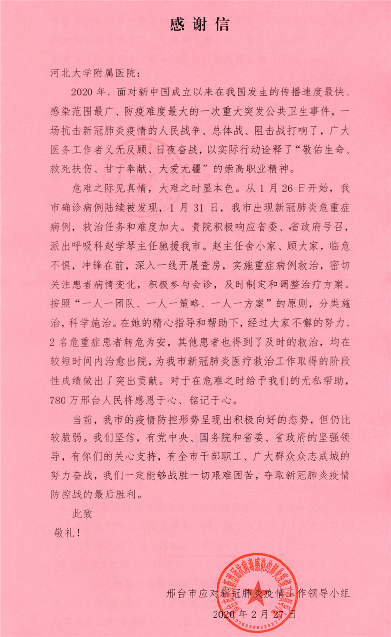 邢台市定点医院自2020年1月26日开始收治首例新冠肺炎患者,2020年2月26日邢台市新冠肺炎确诊病例清零,经过一线救治团队和省市专家的共同努力,邢台市新冠肺炎患者医疗救治工作取得阶段性成果,疫情防控形势呈现出积极向好的态势,邢台市应对新冠肺炎疫情工作领导小组对我院派出的省级专家内科主任、呼吸内科首席医师赵学琴驰援该市救治新冠肺炎危重症患者表示感谢。