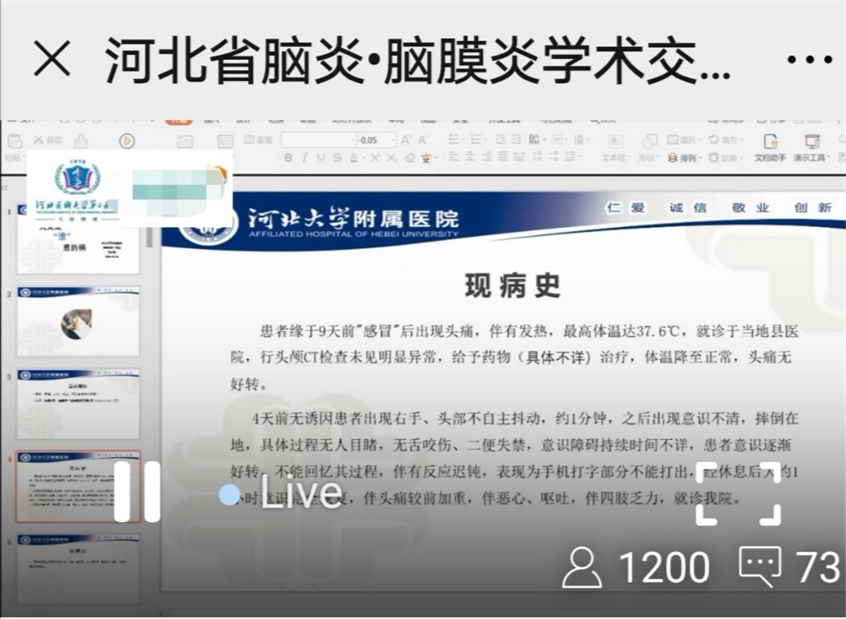 此外,河北省中枢神经感染学组组织了线上交流活动,我院神经内科一病区主治医师陈亚南分享了“病毒感染继发抗N-甲基-M-天冬氨酸受体(NMDAR)相关自身免疫性脑炎”,自身免疫性脑炎是国家罕见病目录病种之一,自2007年世界首次报道抗NMDAR脑炎以来,以及近年一些新型抗神经抗体的出现,部分自身性免疫性脑炎可精准诊断、精准治疗,但临床上非专业临床医师对此类疾病认识不足,此次青年医师线上病例交流,让大家对自身免疫性脑炎再认识——感染可继发抗NMDAR脑炎,尤其儿童和青少年颅内感染,当临床上抗病毒、抗感染治疗病情无明显好转时,要进一步检查有无继发抗NMDAR脑炎可能。此次病例分享受到省内专家的好评和高度认可,也充分体现了我院神经内科在此专业领域的技术水平。