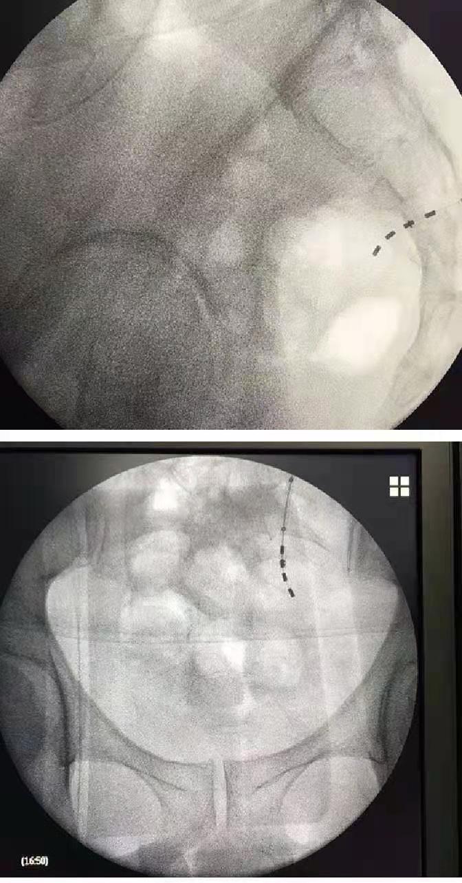 患者于6月27日成功进行骶神经调节电极植入(一期)手术,手术邀请国内尿控领域知名专家、北京朝阳医院张鹏教授指导并共同完成。整个手术在局麻、C臂透视下进行,通过皮下隧道将电极置入骶3神经孔,术中经过反复测试,患者反应良好,四个触点均在1V以下起效,成功完成了骶神经调控一期电极植入。