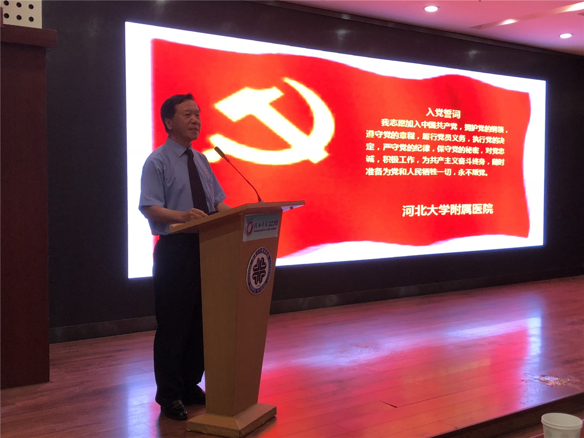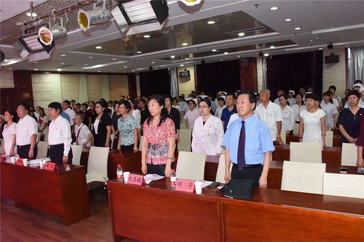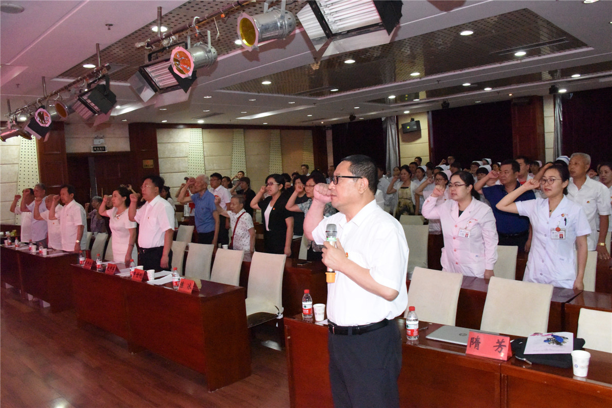 大会在庄严的国歌声中拉开帷幕。申世刚发表了《牢记历史使命 争当时代先锋》的讲话,首先,他代表院党委向受表彰的先进党组织和个人表示祝贺,向辛勤工作、甘于奉献的全院共产党员致以节日的祝贺和崇高的敬意。在讲话中,他回顾了一年来我院在党建工作和医院建设上取得的成绩,传达了中共中央办公厅印发《关于加强公立医院党的建设工作的意见》文件精神和教育部在成都召开的新时代全国高等学校本科教育工作会议精神,并结合我院发展的机遇和挑战对全院党员提出了以下四点要求和希望:一是要始终坚持党的领导,把握正确的政治方向。每一名党员干部都要不断加强学习、指导实践,与时俱进、推动医疗工作不断进步。二是要始终坚持 “党要管党、从严治党”的根本要求,不忘初心,做合格党员。全院各级党组织、全体党员都要牢固树立“四个意识”,切实把努力践行“对党忠诚、做人干净、敢于担当”融入到医院建设改革与发展中,融入到我们每个人的岗位工作中,融入到为广大患者的真情服务中,充分发挥好党员干部的示范作用。三是把党的政治建设摆在首位,抓好党的建设。不断提升工作标准,把基层党组织建设成为推动科学发展的战斗堡垒,做到“每一个支部都是一个堡垒,每一名党员都是一面旗帜”,把党员干部队伍建设成为干事创业、积极作为的先锋模范。四是希望今天受表彰的先进党组织和个人,珍惜荣誉,谦虚谨慎,戒骄戒躁。全体党员一定要以他们为榜样,在今后的工作中自觉传承“仁爱、诚信、敬业、创新”的附院精神,努力践行“服务于患者、奉献于社会”的根本宗旨,始终坚持把“患者的满意”作为我们工作的最终追求,使附院党组织和党员队伍更加充满生机与活力。