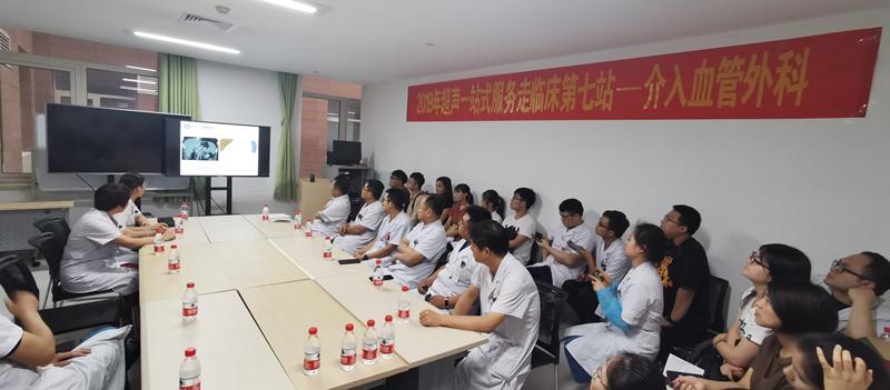 8月8日,“功能科一站式服务”系列讲座有序进行。科主任邸桂新带领功能科的医师们走进介入血管外科,和介入血管外科的临床医生们就外周血管疾病互相学习、探讨和沟通。此次超声讲座由邸桂新主持,两个科室的全体医师和进修规培学员都积极参加了听课学习。