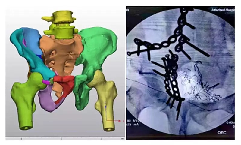 近日,我院骨外科收治一名复发骨盆骨折患者,男性,47岁,主因摔伤3小时右髋部疼痛、肿胀伴活动障碍入院。诊断为:右侧髂骨骨折、右侧髋臼粉碎性骨折、右侧耻骨骨折。经过仔细阅片后,骨外科主任焦建宝、副主任医师薛金伟认为该患者右侧骨盆存在多处骨折,且骨折断裂、移位严重。有必要应用三维可视化辅助进行术前规划及术中指导。我院医学3D影像打印中心副主任张珂经重建后发现本例患者右侧髂骨、髋臼、耻骨碎成13处之多,且多处碎骨存在移位,移位角度偏大。三维重建及手术过程都极为复杂。张珂针对该例患者连夜进行科研攻关,在最短时间重建出准确的骨盆可视化模型,并上传至三维数字云平台方便手术医生随时查看。经过精心术前规划与演练,薛金伟为患者行右侧髂骨、髋臼、耻骨骨折切开复位内固定术。患者手术顺利,手术时间较传统阅片定位后再手术的方法大大缩短,术中C型臂透视可见骨折对位、对线良好,内固定位置良好、稳定。手术结果符合术前三维重建规划预期。目前患者骨折复位质量及骨盆功能均得到良好恢复。