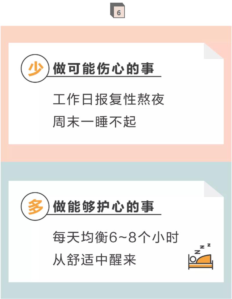 解释:睡眠不足(<5h)或者过长(>9h),都会增加心血管疾病的发生率,所以要保证每天6至8小时的高质量睡眠,同时规律作息。