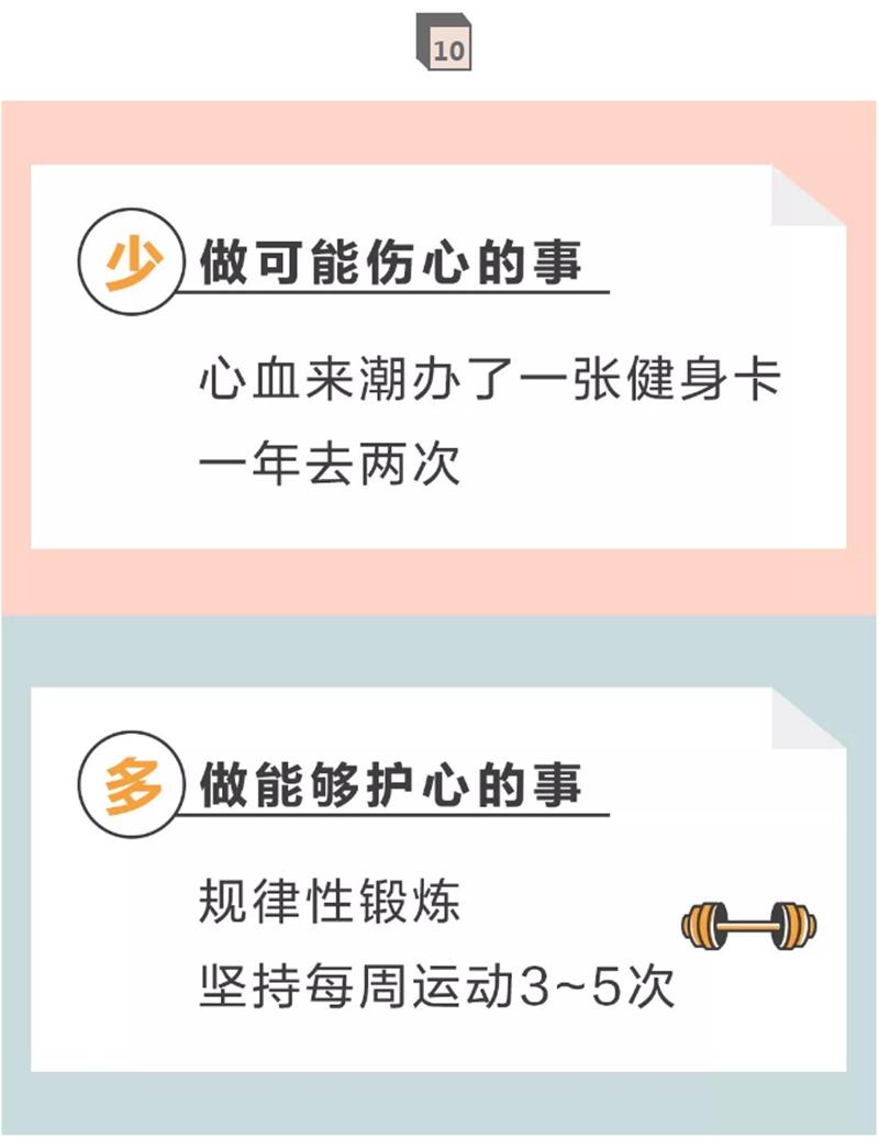 解释:每周3~5次低、中等强度的运动,有助于增加心脏功能,改善血管弹性,增强机体对心血管疾病的耐受性,保护心脏。