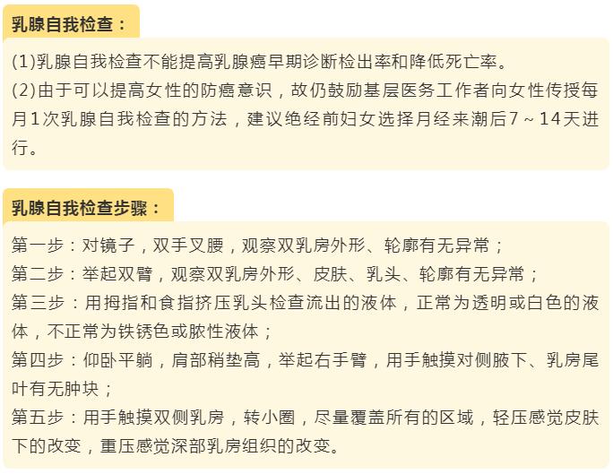 乳腺自我检查如果发现乳腺新发结节、乳头溢液、乳头糜烂、乳头回缩、乳房皮肤凹陷、绝经后乳腺疼痛,请立即就诊。