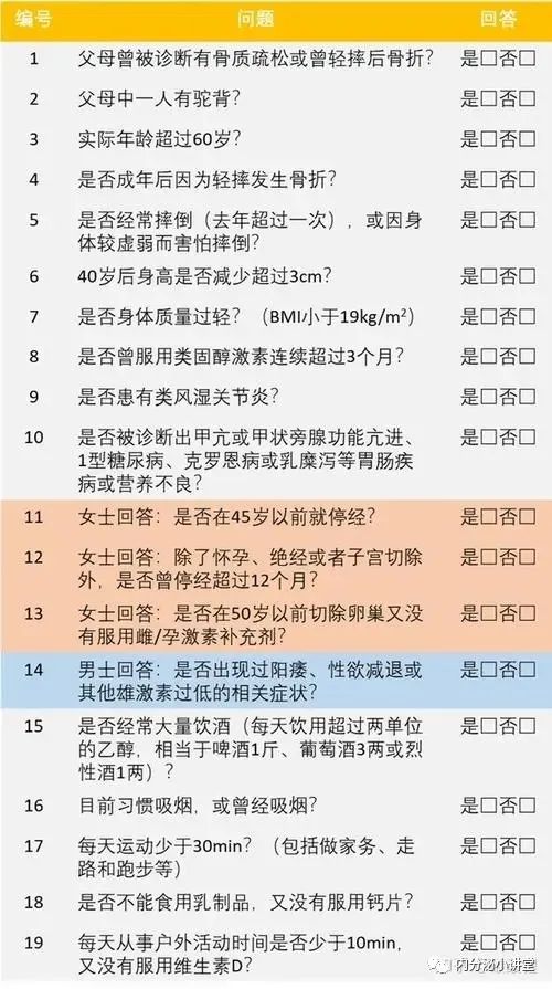 结果评定:上述问题,只要其中有一项回答结果为“是”,即为阳性,提示存在骨质疏松的风险,并建议进行骨密度检查。