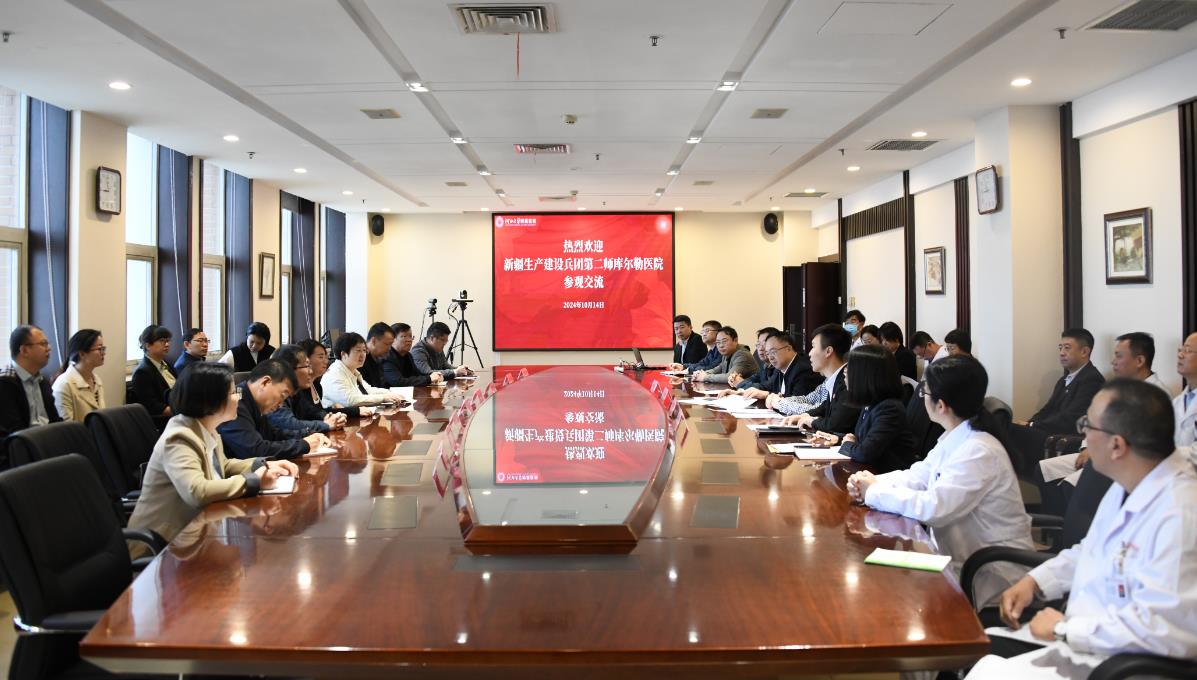 10月14日,新疆第二师库尔勒医院一行16人在院党委委员、副院长宋娇带领下来我院参观考察。我院党委书记程树杰,党委副书记、院长李靖华,党委副书记、副院长史彦芳及相关科室负责人参加考察活动,党委副书记、副院长董斌主持座谈会。
